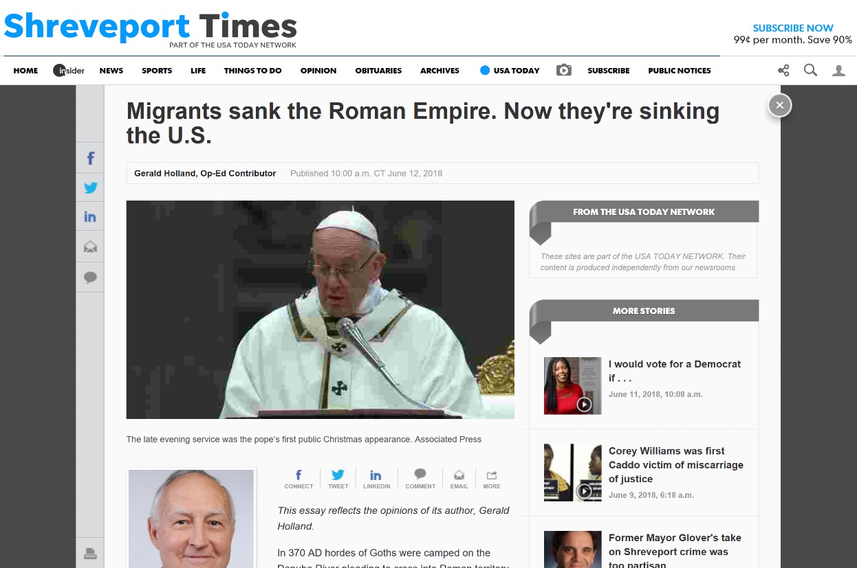 “Migrants Sank the Roman Empire. Now They’re Sinking Us” is the title of a recent op-ed in the Shreveport Times. The article claims that the Roman emperor’s decision to allow Goths seeking protection from the Huns to enter Roman territory in the 4th century CE caused the collapse of the Roman empire, and argues that immigration to the United States and Europe will similarly hasten “the suicide of the West.” Appearing as it does in the primary newspaper of a metropolitan area of half a million residents, this op-ed may seem to represent a mainstream view, but in fact parrots the views of a notorious hate site.